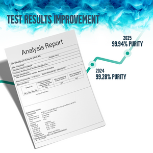 Each production lot is analyzed by a certified U.S. laboratory for identity confirmation and purity levels ≥ 99 %. Continuous improvement has raised purity from 99.28 % (2024) to 99.94 % (2025).