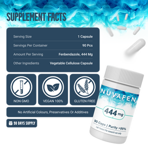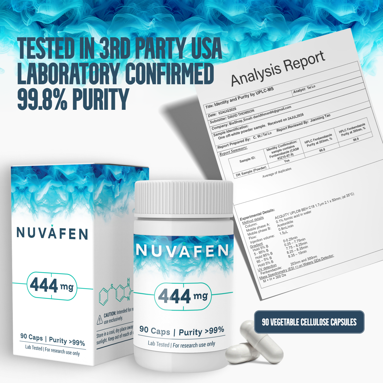 NUVAFEN 444 mg delivers high-grade Fenbendazole capsules verified by an independent U.S. laboratory using UPLC-MS analysis. Each batch meets the highest standards of research-grade purity.