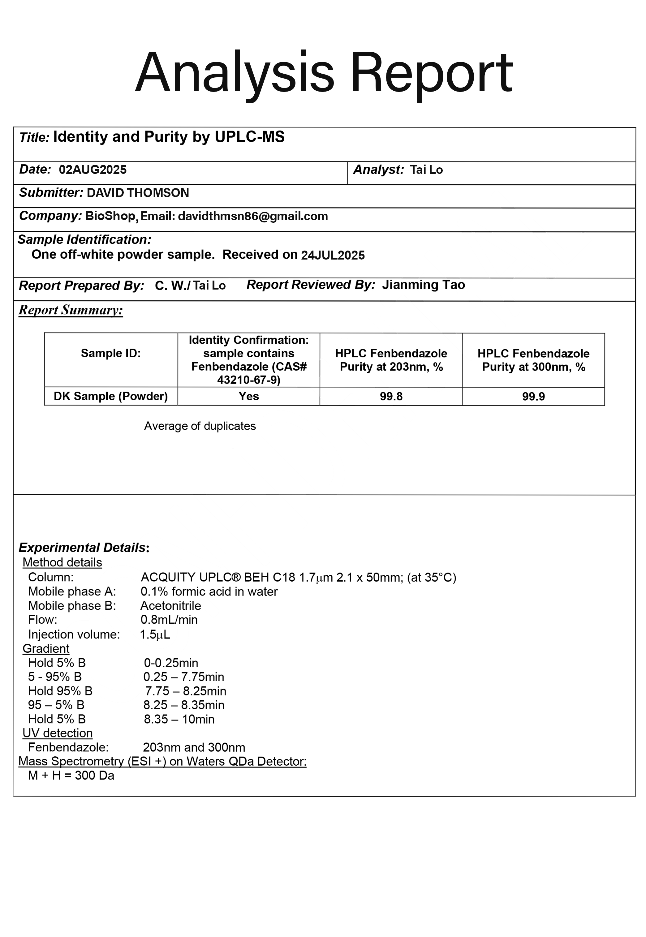 High-purity Fenbendazole verified by independent U.S. laboratories — 99.8 % purity, securely sealed and batch-tracked for research use.